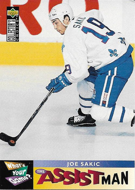 - The back of this card has 3(!) photos of Sakic. I don't know if I've ever seen a card with 3 photos of the same player, save for the 70's OPC/Topps team leader cards.